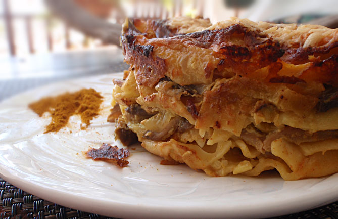 Déposez en alternance dans un plat à gratin une couche de l'appareil, une couche de lasagne (non cuite) puis quelques lamelles de comté. Arrosez de lait. Terminez par le gruyère rapé.