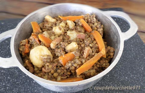 Incorporez les lardons/carottes et les dombrés dans les lentilles.