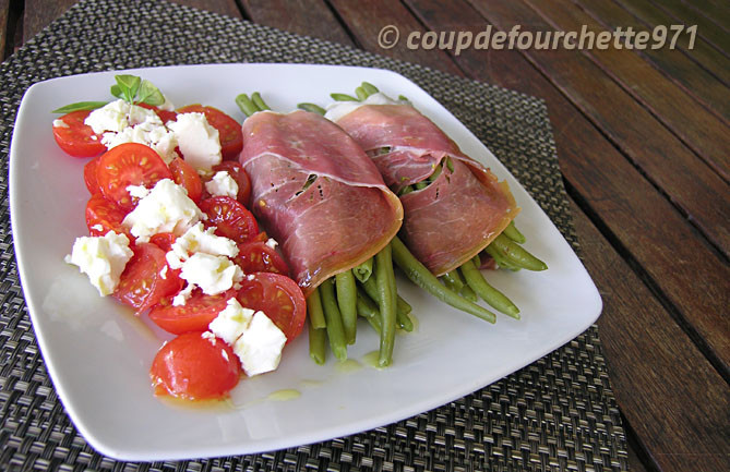 Fagots de jambon cru aux haricots verts et ses tomates grecques