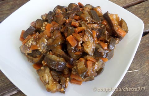 Dans une poêle, faire revenir dans une cuillère d'huile d'olive, les aubergines, les oignons, l'ail haché et les carottes sur feu vif pendant 5 minutes.
