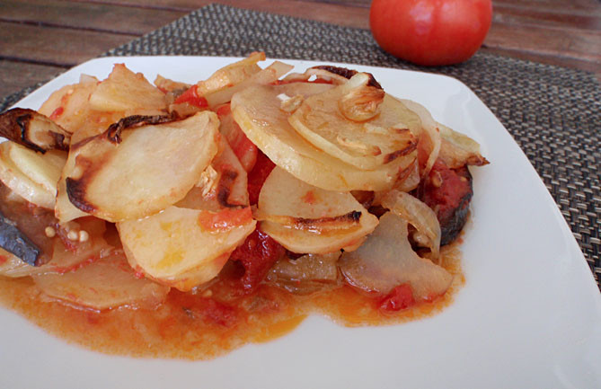 Dans une cocotte haute allant au four, installez dans l'ordre et en couche les pommes de terre en lamelles, les oignons, le saucisson, le chorizo, l'aubergine et les tomates pelées (attention de ne pas mettre trop de jus de tomate), 2 cuillères d'huile d'olive, sel et poivre.