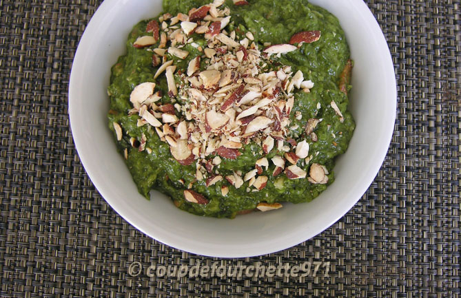 - Au moment de servir, parsemez la purée d'épinards des amandes fumés.